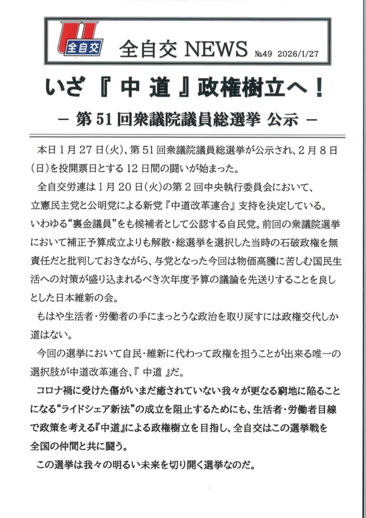 全自交NEWS No.49 2026/1/27を掲載しました。